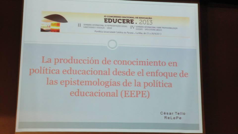 Entre el 24 y el 26 de septiembre el profesor César Tello participó XI Congreso Nacional EDUCERE-Seminário Internacional de Representações Sociais, Subjetividade e Educação (SIRSSE), y el IV Seminário Internacional sobre Profissionalização Docente (SIPD/CÁTEDRA UNESCO). En ese marco dictó una conferencia con el título:“La produção de conocimiento em politica educacional desde el enfoque de las epistemologias de la politica educacional (EEPE)”.
